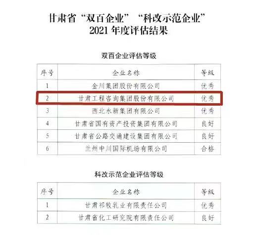 甘肅工程咨詢(xún)集團(tuán)獲甘肅省2021年度“雙百企業(yè)”評(píng)估“優(yōu)秀”等級(jí)