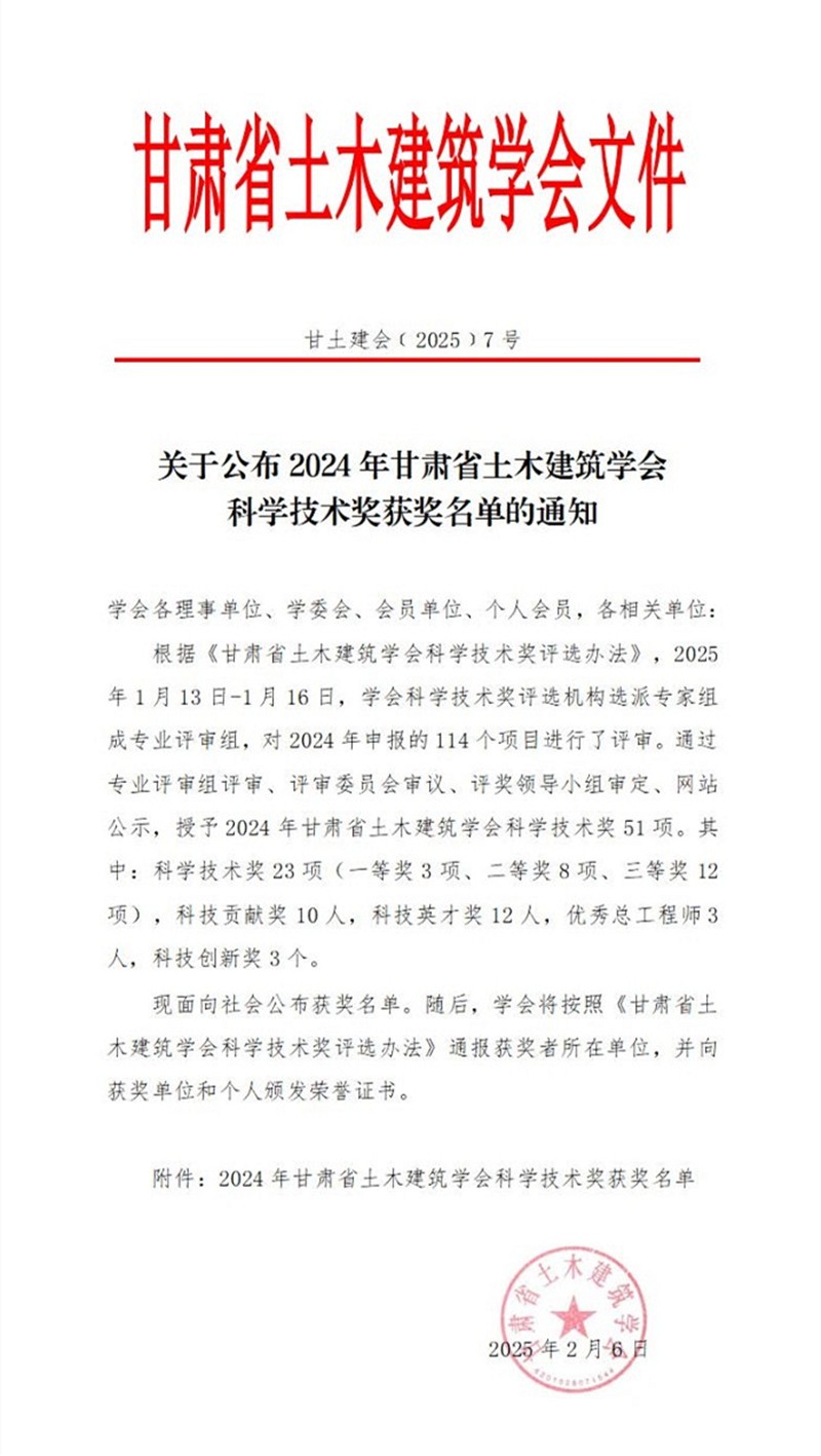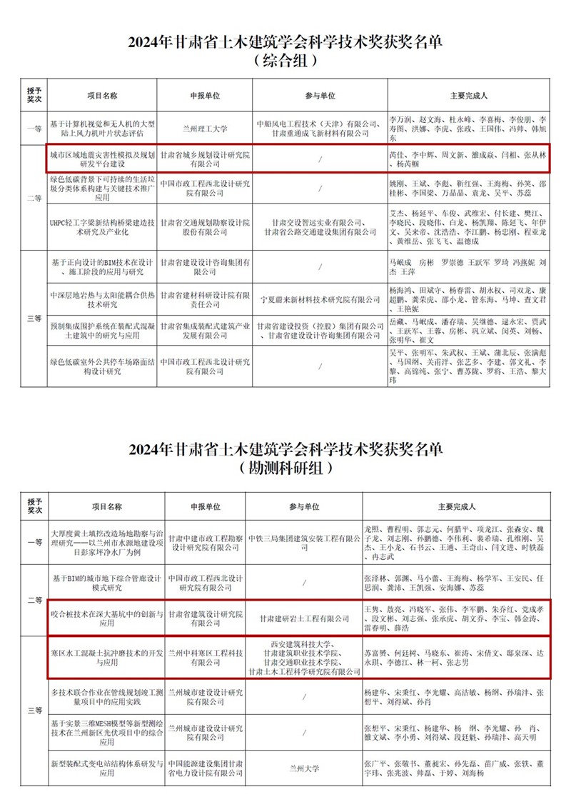 近日,2024年甘肅省土木建筑學(xué)會科學(xué)技術(shù)獎(jiǎng)獲獎(jiǎng)結(jié)果公布,甘肅工程咨詢集團(tuán)斬獲多項(xiàng)榮譽(yù)。其中,省建筑設(shè)計(jì)院申報(bào)的《咬合樁技術(shù)在深大基坑中的創(chuàng)新與應(yīng)用》項(xiàng)目榮獲“科學(xué)技術(shù)獎(jiǎng)(勘測科研組)二等獎(jiǎng)”,省城鄉(xiāng)規(guī)劃院申報(bào)的《城市區(qū)域地震災(zāi)害模擬及規(guī)劃研發(fā)平臺建設(shè)》項(xiàng)目榮獲“科學(xué)技術(shù)獎(jiǎng)(綜合組)二等獎(jiǎng)”,土木工程院參與的《寒區(qū)水工混凝土抗沖磨技術(shù)的開發(fā)與應(yīng)用》項(xiàng)目榮獲“科學(xué)技術(shù)獎(jiǎng)(勘測科研組)三等獎(jiǎng)”。省建筑設(shè)計(jì)院、省城鄉(xiāng)規(guī)劃院4人分別榮獲“科技貢獻(xiàn)獎(jiǎng)”“科技英才獎(jiǎng)”“科技貢獻(xiàn)獎(jiǎng)”“優(yōu)秀總工程師獎(jiǎng)”等榮譽(yù)稱號。