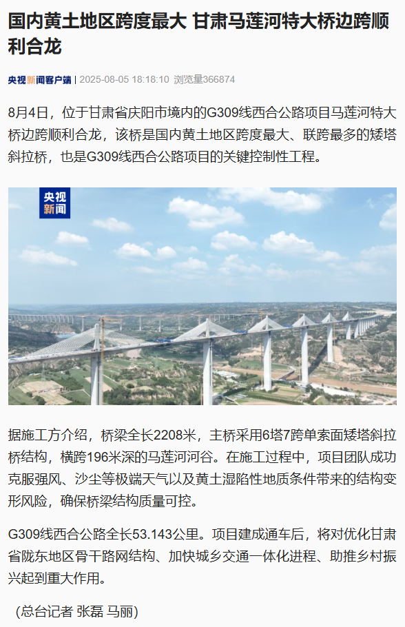 近日,由甘肅工程咨詢集團旗下省交通監(jiān)理公司承監(jiān)的G309線西合公路項目建設取得重大進展——馬蓮河特大橋邊跨順利合龍。項目建成后,將進一步完善區(qū)域路網結構,對促進慶陽地區(qū)經濟社會發(fā)展具有重要意義。