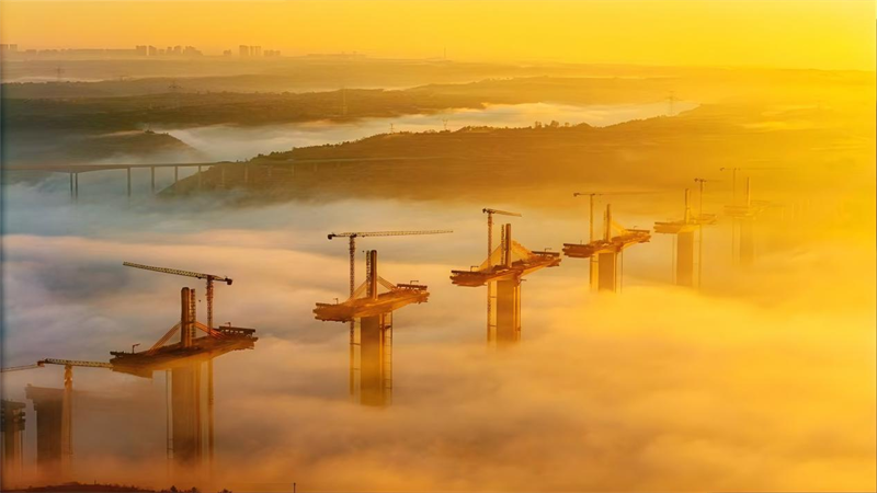 晨光初現(xiàn),建設(shè)中的橋梁在薄霧中若隱若現(xiàn),跨越河流、連接兩岸,為隴東大地經(jīng)濟騰飛插上翅膀。
