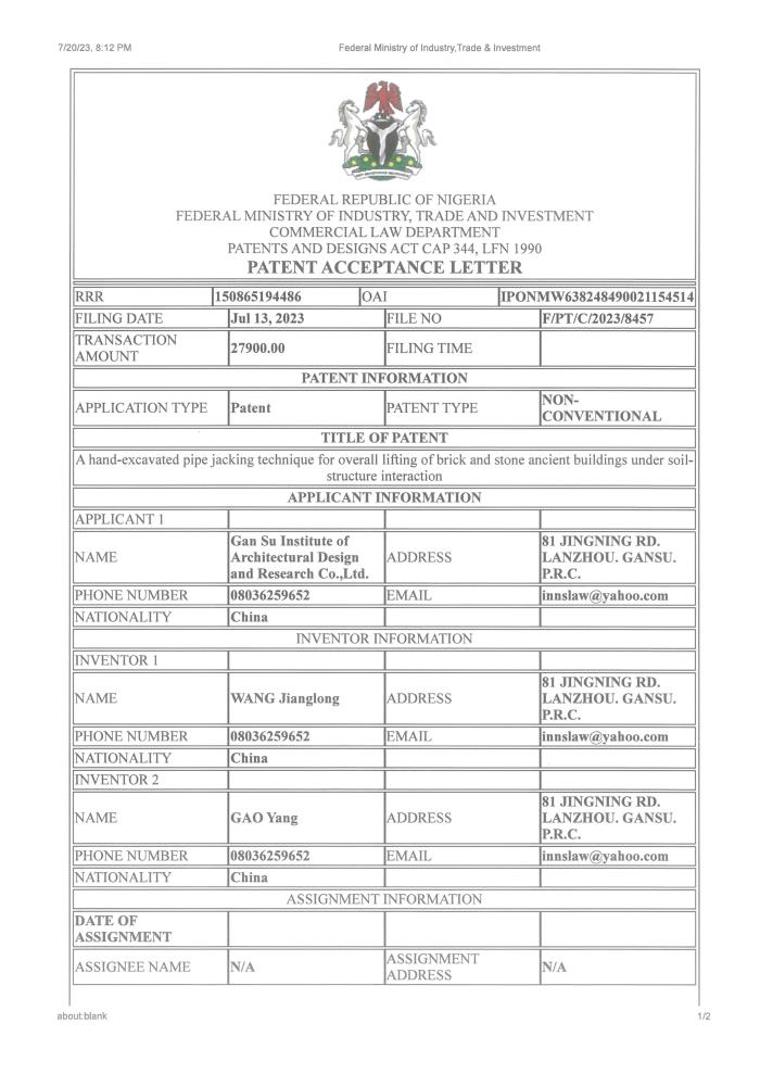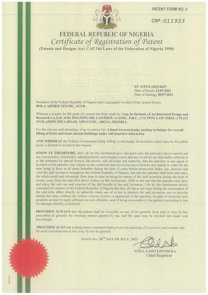 日前,非盟知識產(chǎn)權局對省建筑設計院王江龍等申報的“土-結構相互作用下磚石結構古建筑整體頂升手掘式頂管技術”(A hand-excavated pipe jacking technique for overall lifting of brick and stone ancient buildings under soil-structure interaction)進行授權,為省建筑設計院后續(xù)承接援外項目及國外項目給予了堅實的技術支撐。