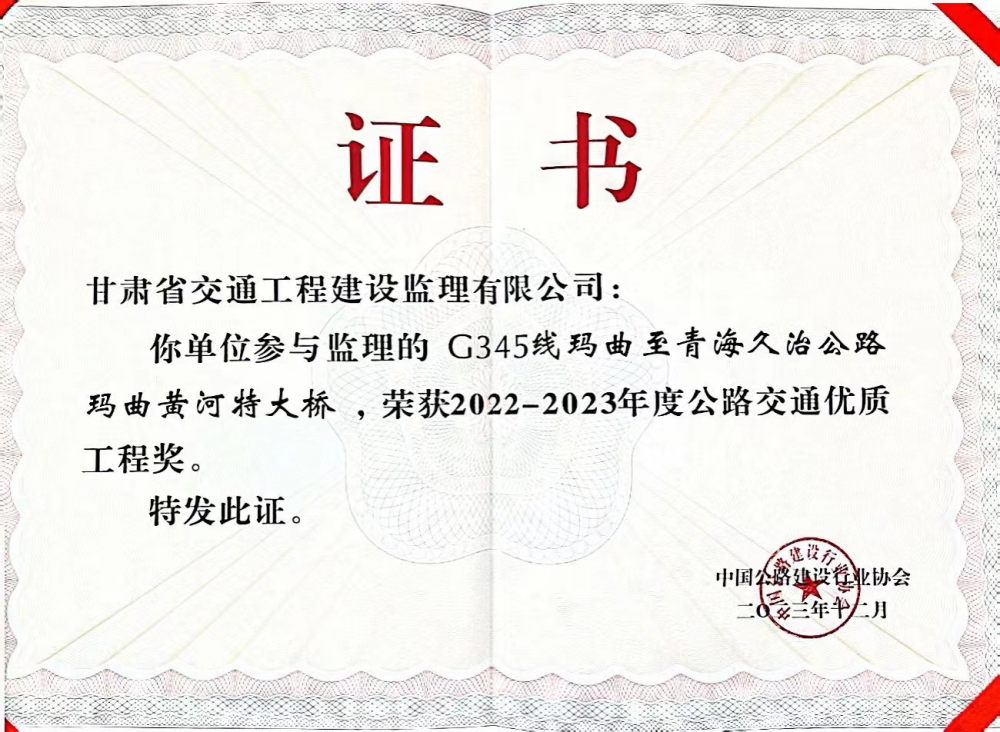 近日,中國公路建設(shè)行業(yè)協(xié)會于湖北武漢召開第五屆公路建設(shè)高質(zhì)量大會暨2022-2023年度公路交通優(yōu)質(zhì)工程獎表彰大會。省交通監(jiān)理公司“代建+監(jiān)理”的G345線瑪曲至青海久治公路瑪曲黃河特大橋榮獲公路交通優(yōu)質(zhì)工程獎。此次獲獎系公司在兩徽、金阿高速公路之后第三次獲得全國公路交通優(yōu)質(zhì)工程獎——李春獎。